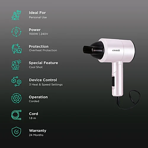 Style and dry your hair effortlessly with this Hair Dryer with 3 Heat Settings & Cool Shot in an elegant pink finish. Designed for all hair types, it features a 1100W motor that generates optimal airflow to dry hair quickly while minimizing damage.