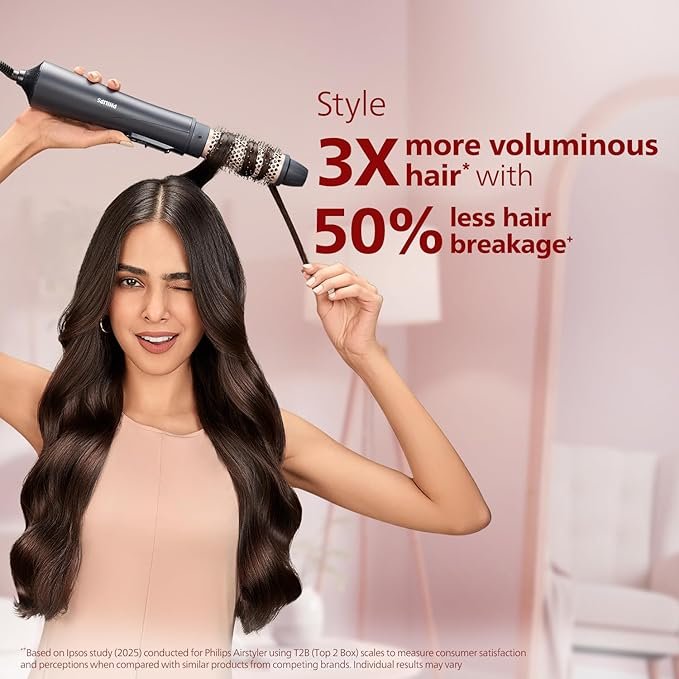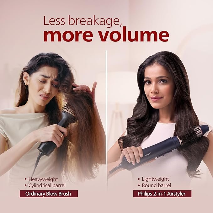 The device includes 2 attachments for creating volume, curls, or waves, providing versatility and convenience. It is engineered to give 3X more volume with 50% less hair breakage, protecting your hair from excessive heat and damage. Lightweight and ergonomic, the Philips 2-in-1 Airstyler is easy to handle, making daily styling quick and comfortable.