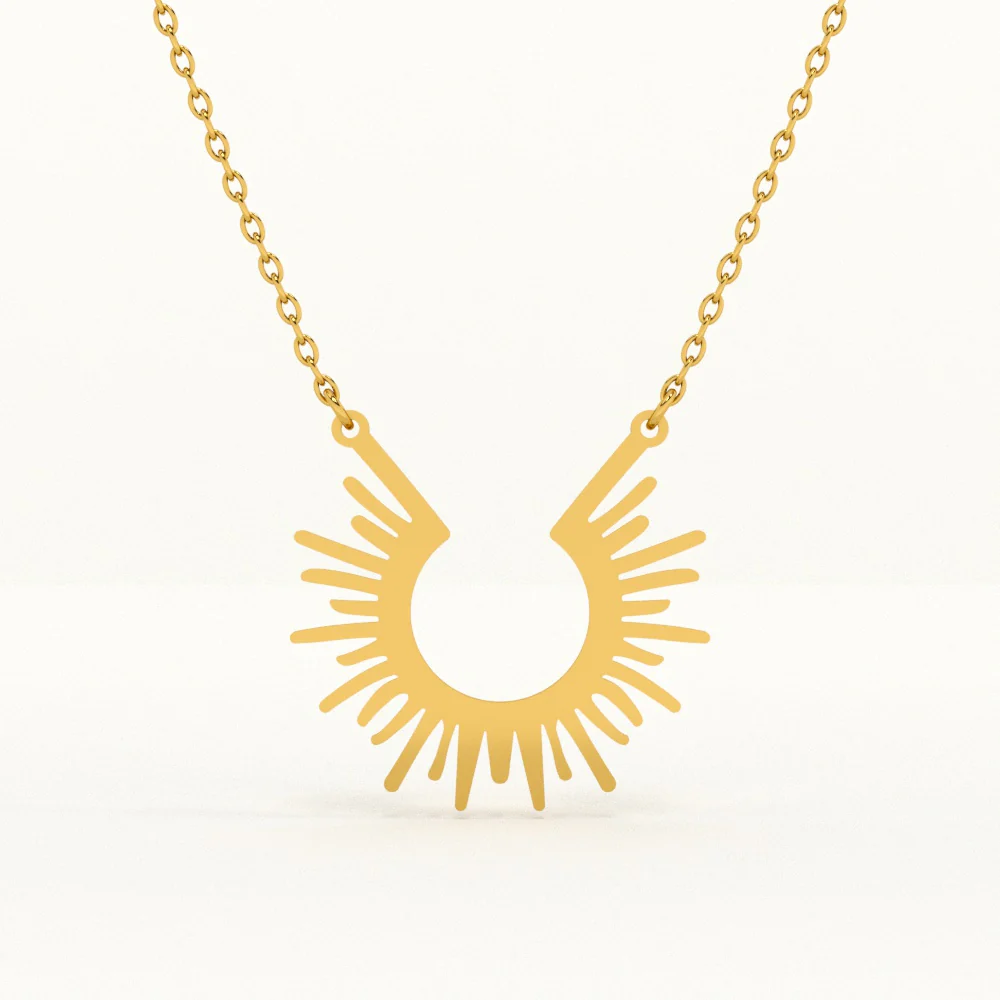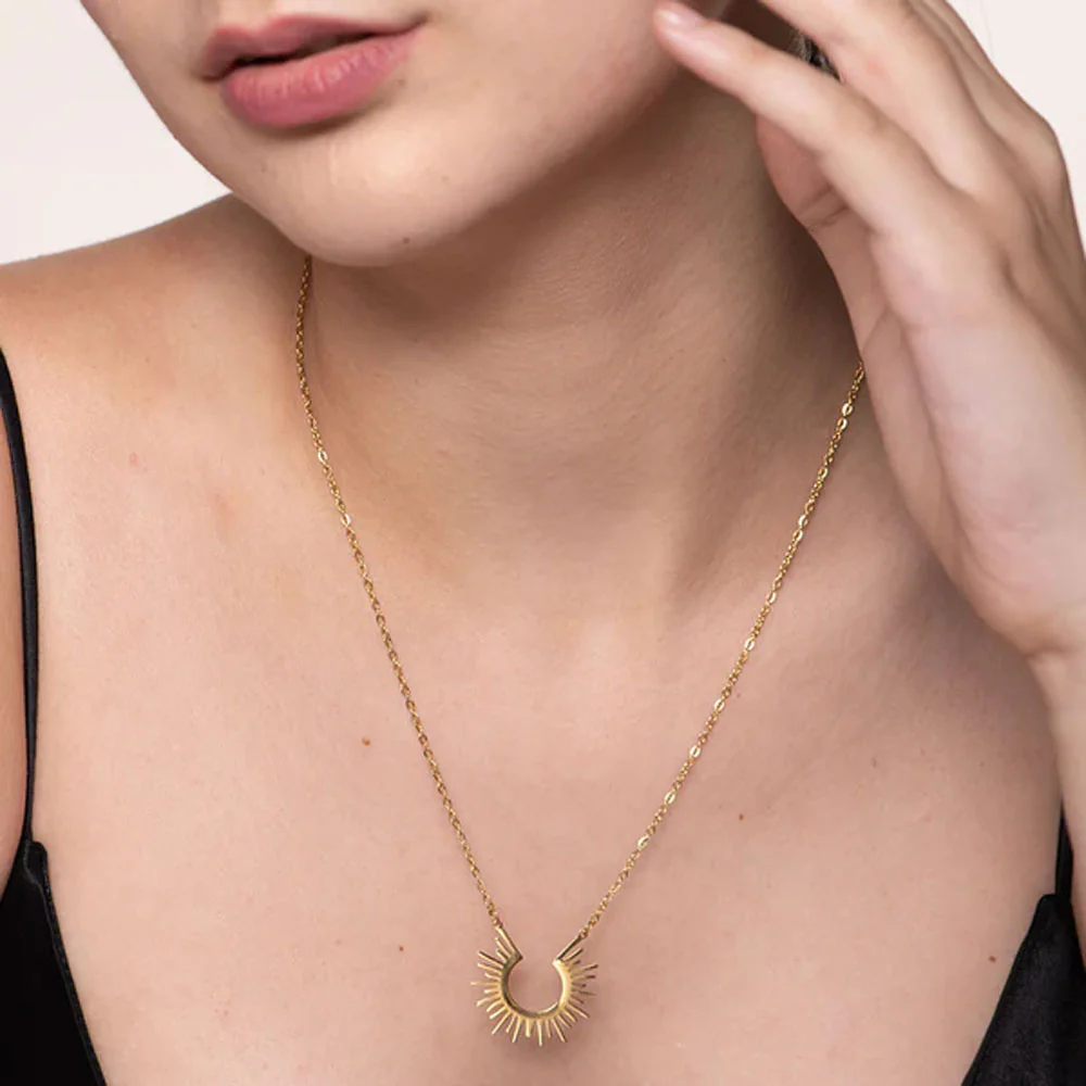 The stunning sunburst pendant represents light, positivity, and new beginnings—making it more than just jewellery, but a symbol of strength and hope. Crafted in high-quality stainless steel and finished with a lustrous 18k gold tone plating, it promises lasting shine and durability.