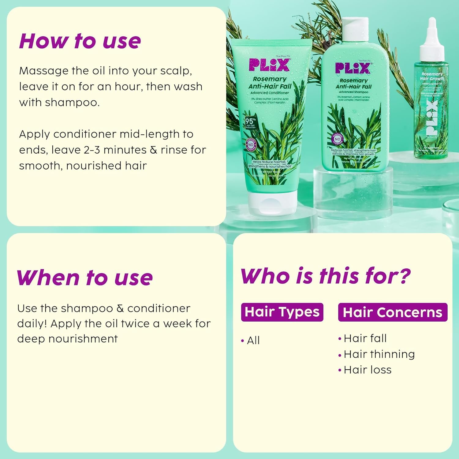 The Plant Fix Plix 475mg Rosemary Hair Growth Advanced Oil, Shampoo & Conditioner | Anti-Hair Fall Trio | Dermatologically Tested